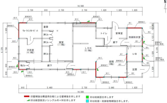現況の一階上部構造評点を0.3ポイント以上向上させ、かつ1.0以上にする耐震補強工事